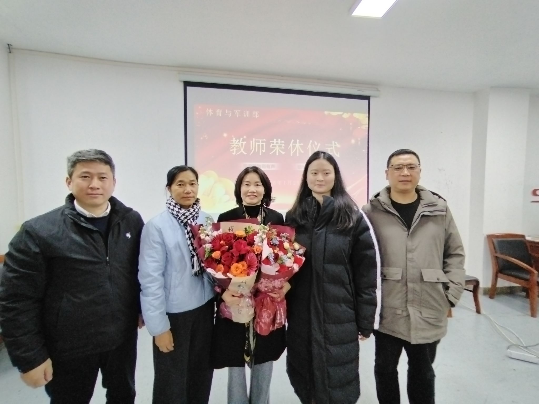 大会结束后,同步举行退休教师荣退仪式。仪式现场暖意融融,退休教师潘四凤发表荣退感言,深情回望了在学校数十年的耕耘历程与奋斗时光,对学校给予的成长平台、部门提供的支持保障及同事们的陪伴关怀表达了诚挚谢意,同时对体军部未来的发展前景寄予了美好期许。青年教师代表为潘四凤老师献上鲜花,以一束芬芳传递敬意与祝福,传承教育薪火,充分彰显了体军部尊师重教、薪火相传的优良作风。
