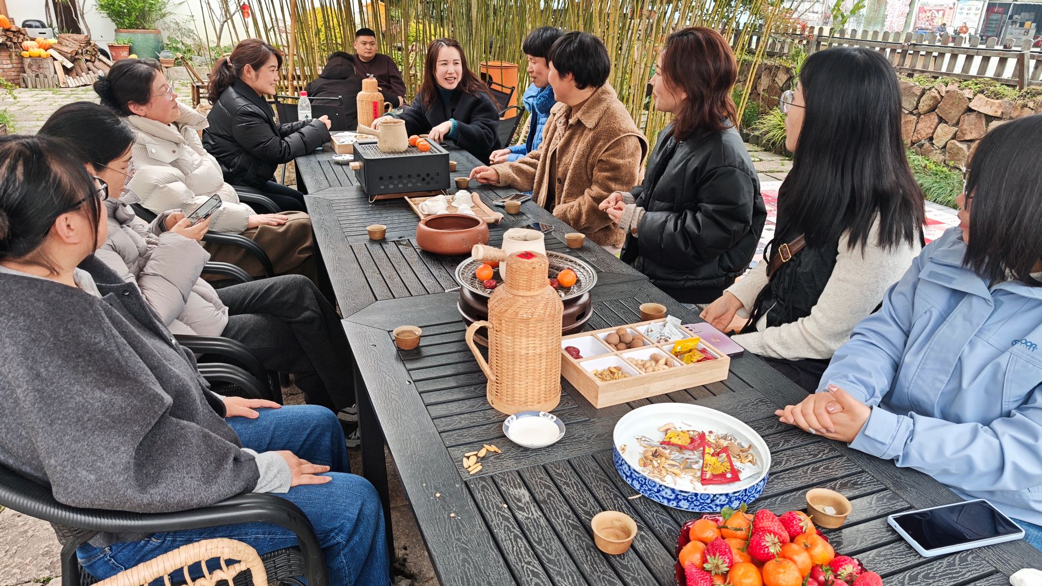 采摘结束后,老师们围坐在一起,开启了惬意的“围炉煮茶”时光。炭火微温,茶香袅袅,大家品茗谈心,分享着工作与生活中的点滴感悟,在氤氲的茶气中拉近了彼此的距离,气氛温馨融洽。